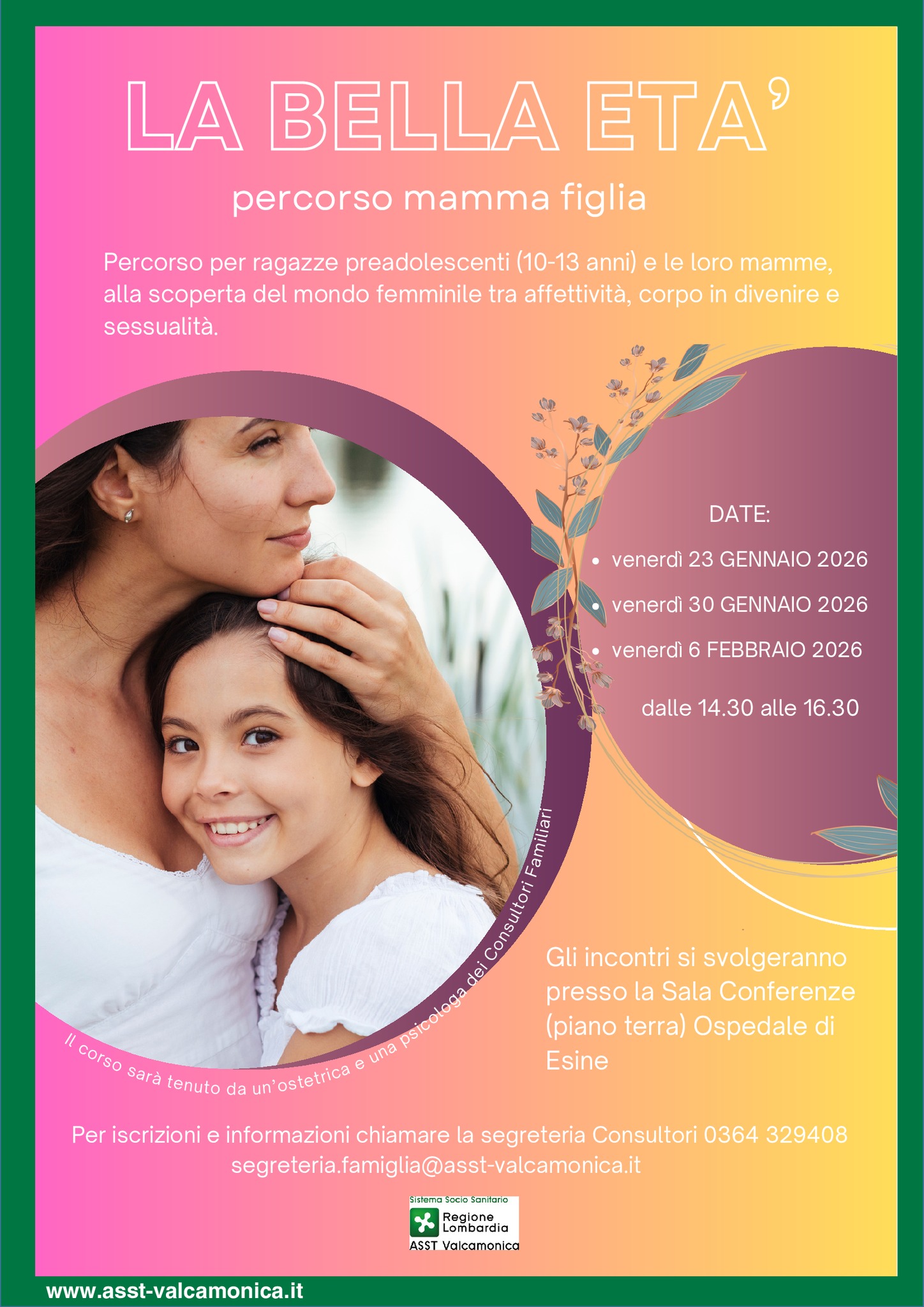 Per iscrizioni e informazioni è possibile contattare la Segreteria dei Consultori ai recapiti indicati nella sezione Contatti.